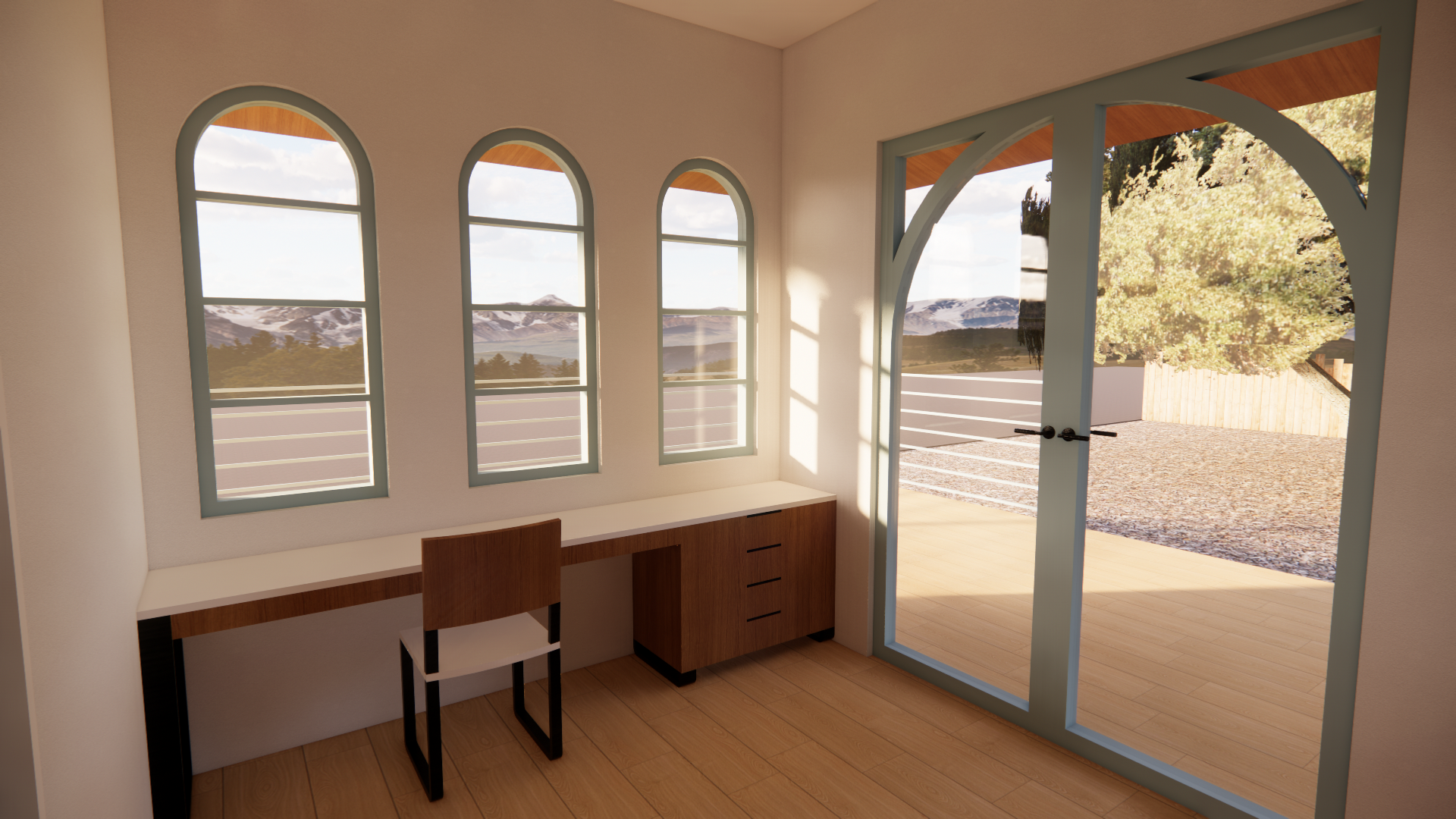This single-story home is inspired by modern Mediterranean design to create a comfortable and inviting space. The home features white plaster walls, arch details, and light blue trim on the windows and doors. The house and landscape are terraced to have 3 levels. The main house features 3 bedrooms and 2 bathrooms along with an open concept living and dining space. The main house has access to the garage as well as a wraparound covered porch and a multipurpose gym or band room. The second terrace features a pool, sundeck and pool house with a sauna, powder room and outdoor shower. The last terrace features an outdoor kitchen and dining area as well as the potential for a garden and solar panel area. The home is designed to promote a flow between the indoor and outdoor spaces and feel like a luxurious getaway in your own home.